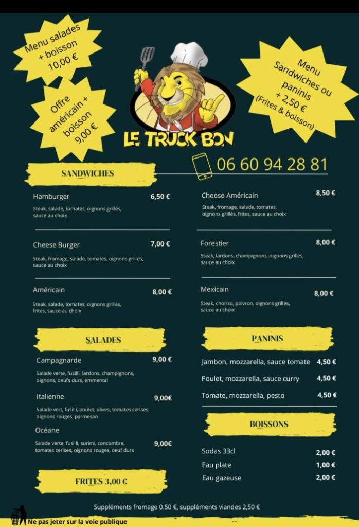 Une petite faim? Le truck bon s’en occupe Burger mENUS dessert bOISSONS Prêts à vous servir avec le sourire !